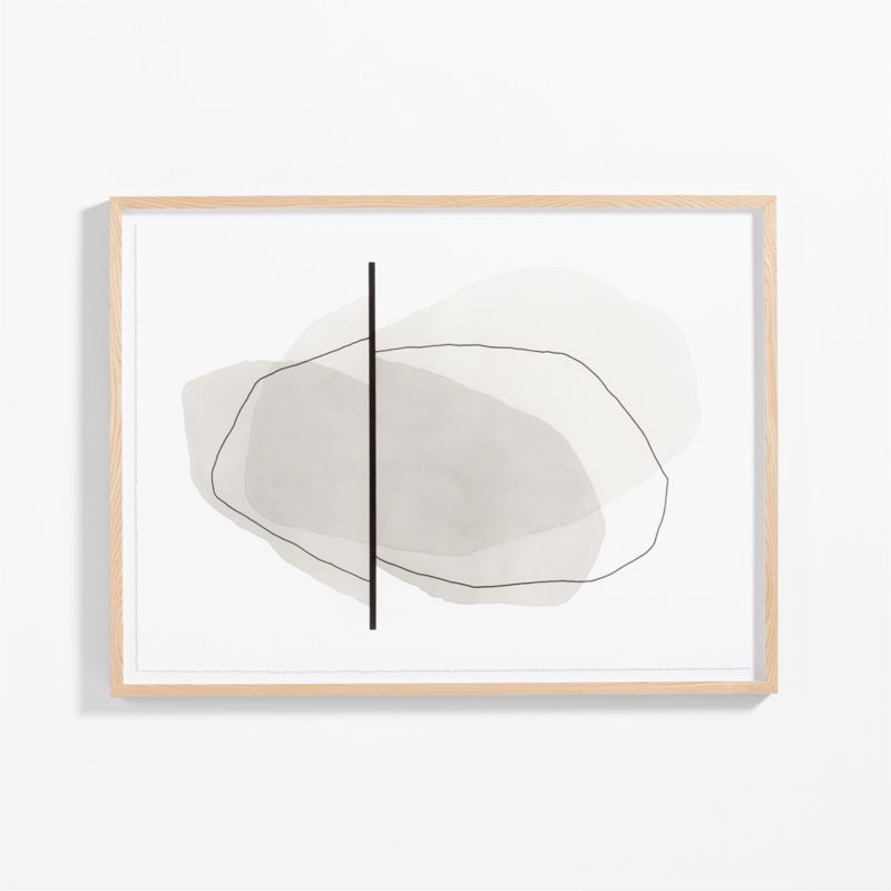 Inspired by nature and influenced by minimalism, Kim Knoll uses abstract shapes to suggest a neutral-toned scene. As the title "Underwater" suggests, the carefully balanced composition suggests reflection and refraction of light on water with layers of organically washed and drawn ovals offset by a dividing line of vertical black. Our giclee print on paper faithfully reproduces the nuanced tones of the original acrylic and ink painting and is neatly presented under glass in a light oak-finished wood frame.