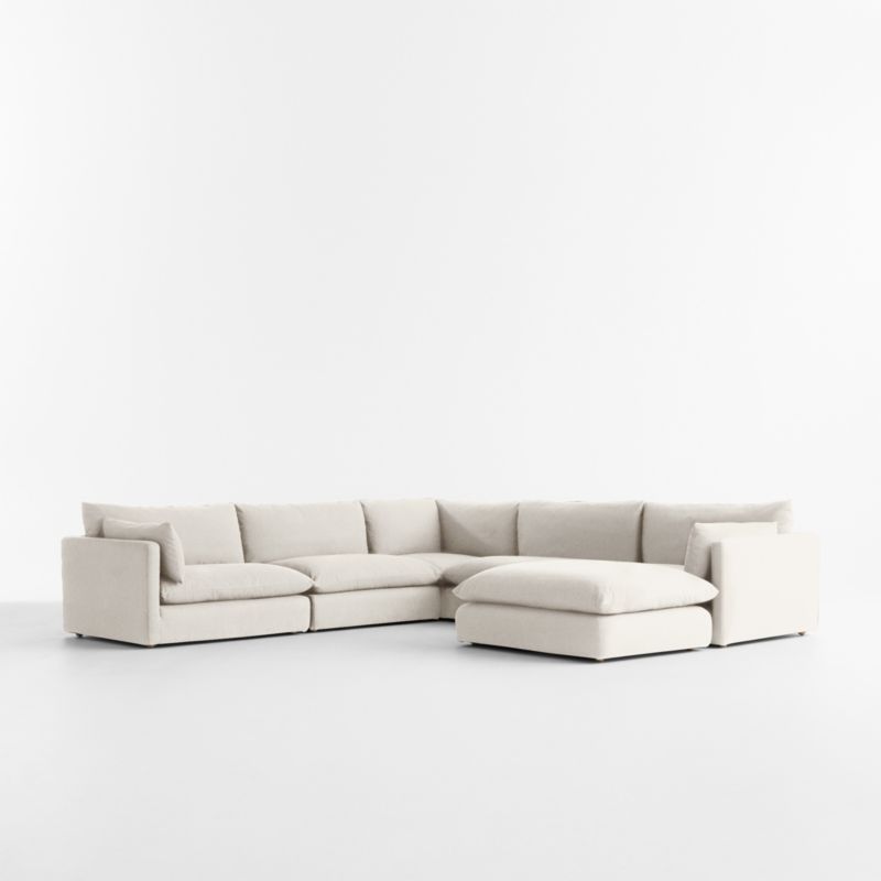 It's time to Unwind with our coastal-cool slipcovered sectional collection. Named after our favorite thing to do, this modern beauty delivers relaxing proportions and sumptuous sink-in cushions. The six-piece sectional—left- and right-arm chairs, armless chairs, corner and an ottoman—feature slim arms and low decks that make room for pillowy back and seat cushions for an exceptionally deep, comfortable sit. We love the natural feel and slubby texture of the slipcovers, made of a breezy blend of cotton, linen and viscose yarns.