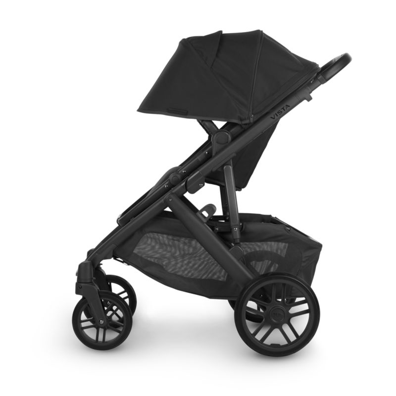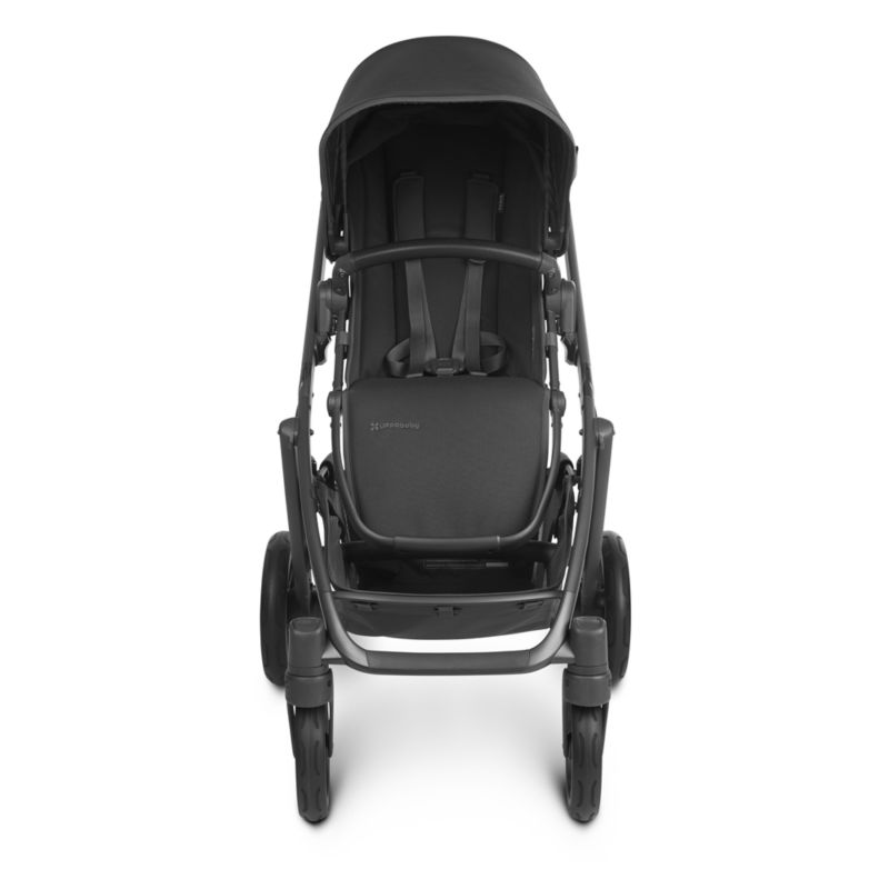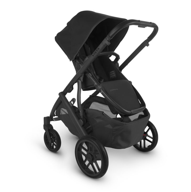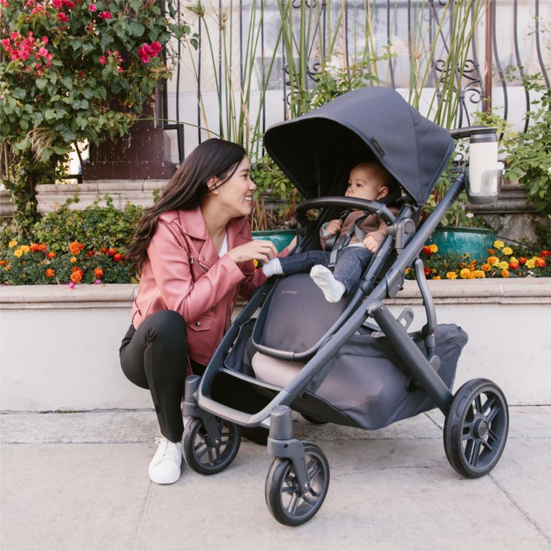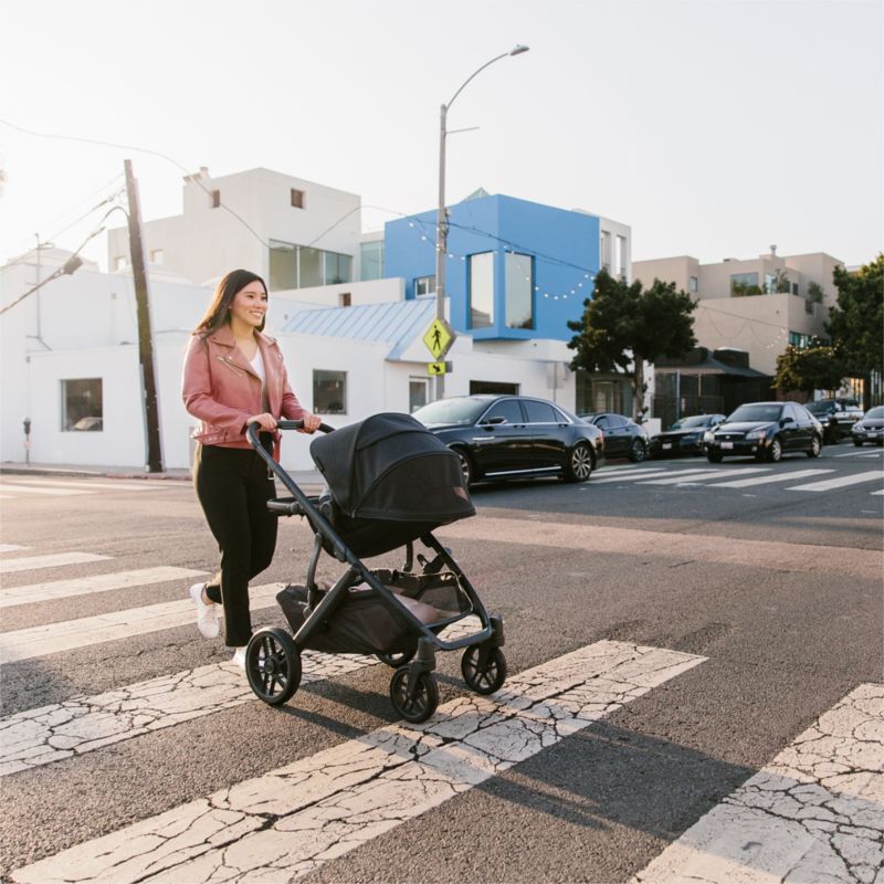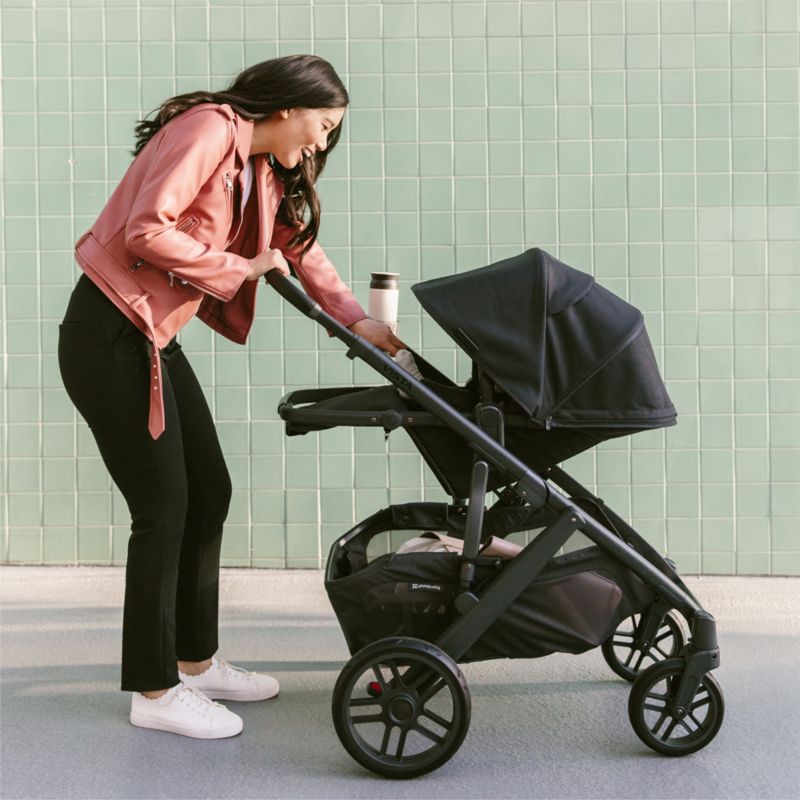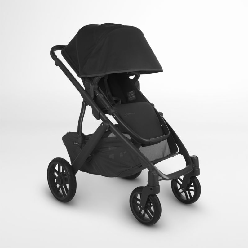 This versatile black stroller by UPPAbaby has a clever, intuitive design that allows for multiple combinations of car seats, toddler seats and bassinets. As a single stroller, it holds a detachable bassinet with a ventilated shade canopy for easy naps on the go. Swap it out with the reversible toddler seat, which has multiple recline positions for comfort and an extendable, UPF 50+ zip-out canopy. When your family grows, just add another seat to carry two children in one stroller. A telescoping handlebar, extra-large basket and one-step fold design are thoughtful details that make this system a perennial parental favorite.