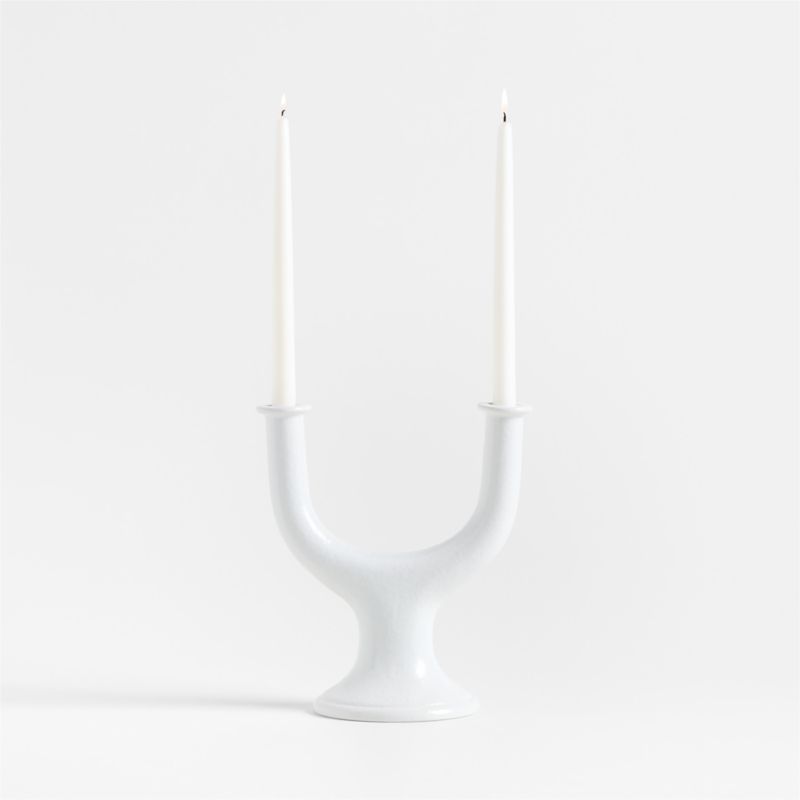 Inspired by ancient ceramics discovered on the coast of Italy, our Valla candle holder showcases the same timeless artisanship. Skilled craftspeople shape the stoneware wishbone before applying a thick coat of glossy white volcanic glaze by hand. The result is fresh, modern and intriguingly textured—like a found object or Italian flea market treasure. Pair the U-shaped double taper holder with the other candlesticks in our Valla collection to create a sunbaked, coastal vibe.