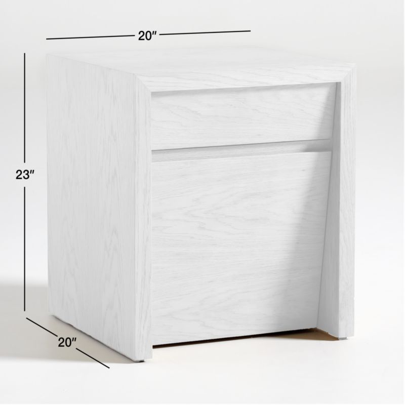Modern, monolithic Vander angles an architectural end table with cleverly integrated storage. Wirebrushed and given a natural finish to bring out the natural grain, the oak veneer table shapes a waterfall silhouette to frame two stacked drawer fronts set back at a rakish angle. We love Vander's architecture-inspired profile and dramatic sculptural effect, not to mention its generous storage capacity. The Vander storage end table is a Crate & Barrel exclusive.