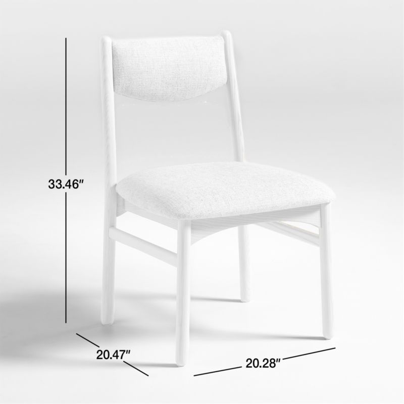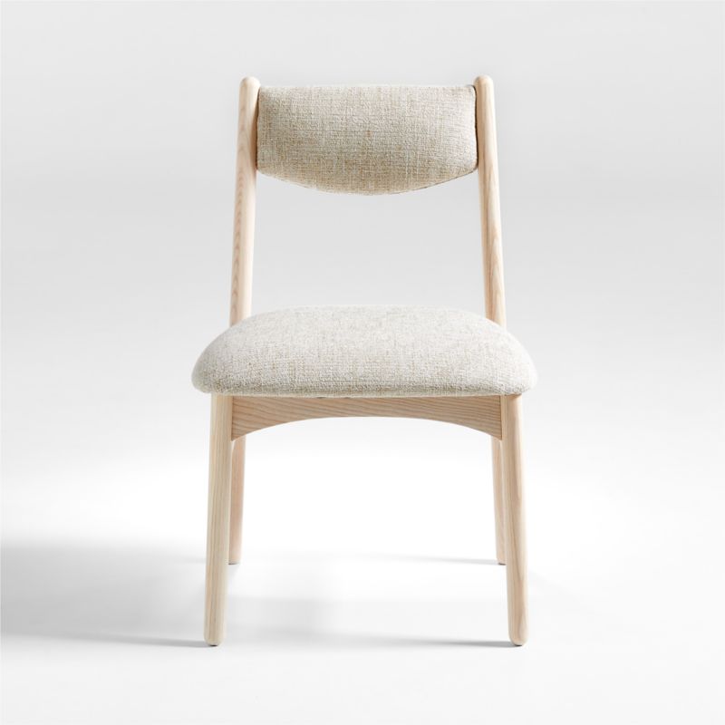 Recalling the organic curves of Art Nouveau, our Vaquero chair streamlines a contemporary dining chair that's fresh and playful. Round legs and an arched apron lend movement to the minimalist frame crafted out of ash treated to an on-trend, low-sheen bleached finish. Neat, tight cushions upholstered in a neutral-tone fabric shape the seat and the floating half-moon back. The Vaquero dining chair is a Crate & Barrel exclusive.