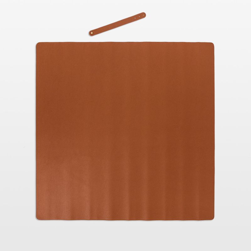 Upgrade your game with the look of leather. Made to look like the real thing, this faux leather mat sets the stage for play in rich caramel with lifelike pebbled texture. A soft backing keeps the mat from slipping, tamps down on sound and protects table surfaces. The mat rolls up and secures with its band for easy transport and storage.