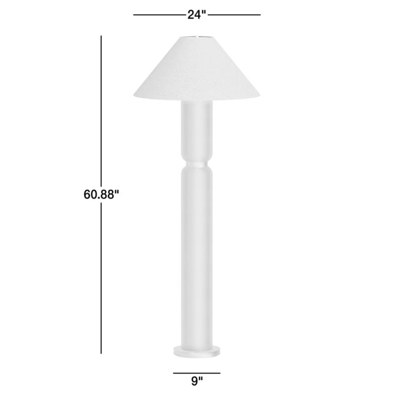 Velato encases a typical floor lamp in sculptural glass to create something unexpected. Rising from a burnished brass-finished base, a column of smoky slate grey glass surrounds the slender central stem. A gleaming metal ring cinches the tube to create clean curves and a striking silhouette. The white fabric shade diffuses light softly while keeping all of the attention on the unique base.