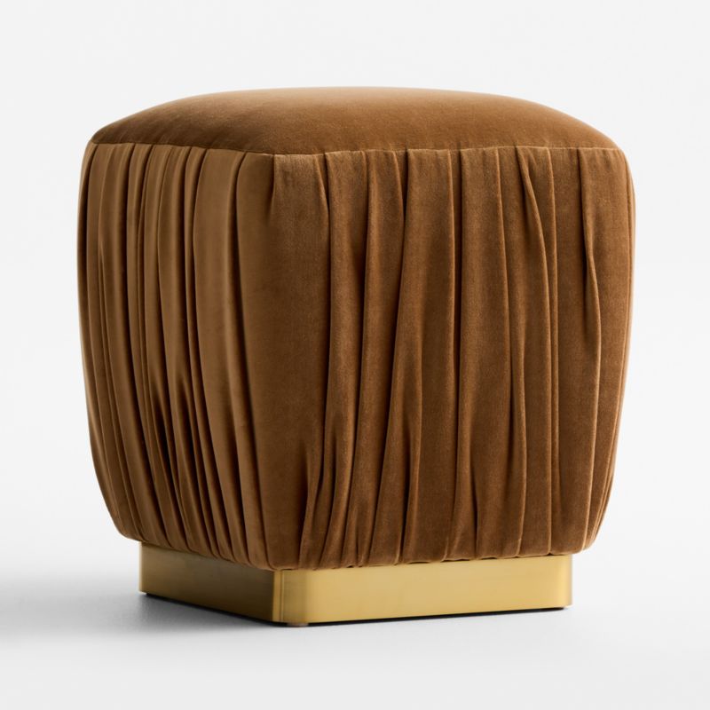 Channeling classic Hollywood glamour, this ottoman exudes an understated drama that feels both nostalgic and modern. Beautifully tailored in a bronze cotton-blend fabric with loose ruching on the sides and softly radiused corners, the ottoman tapers to a burnished brass base. Layered foam cushioning offers a firm foundation for vanity-table primping, leg propping or casual seating.