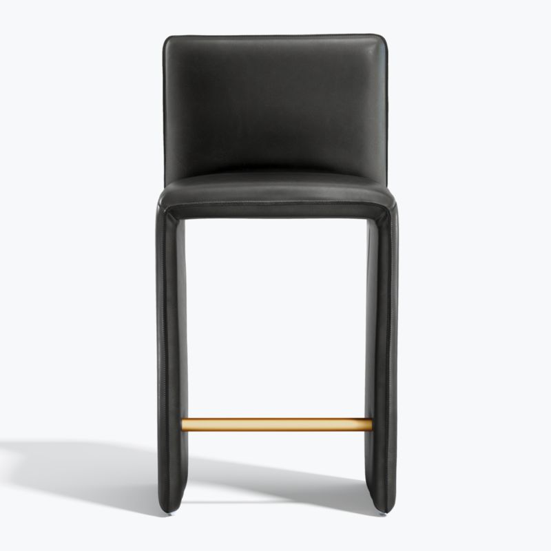 Clean and sophisticated, our Venn counter stool brings a modern yet timeless design to the kitchen island or high-dining table. The stool's waterfall silhouette flows the seat into solid plank-style legs that lend it a sculptural presence. Upholstered in lustrous black leather, Venn's right angles are softened with rounded cushioning and a footrest for a comfortable stay. Raw seams highlight the natural beauty of the leather upholstery, while a vertical seam down the middle of the leg gives Venn an intriguing side profile. The Venn leather counter stool is a Crate and Barrel exclusive.