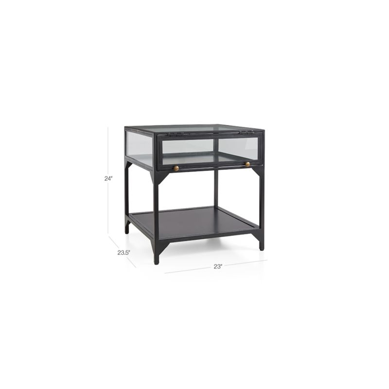 Combining the rustic look of iron with apothecary-shop charm, the end table is sleek and slim with one hinged, tempered glass door, brass knobs and a solid bottom shelf.