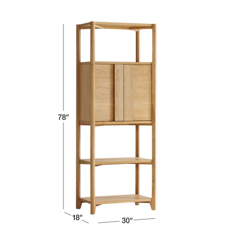Vertex's converging angles make a dynamic play of oak's beautiful cathedral grain. An integral element to the bookcase's animated design, the wood grain reverses direction on the frame, shelves and cabinet doors with bold, integrated pulls. Dual-function Vertex opens to a full-service bar stocked with an antique-finished mirror, wineglass rack, adjustable shelf and pull-out tray with brass knob. Tap the wineglass rack and a three-setting light turns on to illuminate the interior. The Vertex Bookcase Bar is a Crate and Barrel exclusive.