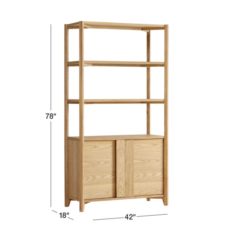 Vertex's converging angles make a dynamic play of oak's beautiful cathedral grain. An integral element to the bookcase's animated design, the wood grain reverses direction on the three fixed shelves and cabinet doors with bold, integrated pulls. Outfitted with an adjustable interior shelf, the cabinet provides storage for books, board games or office supplies. The Vertex bookcase is a Crate and Barrel exclusive.