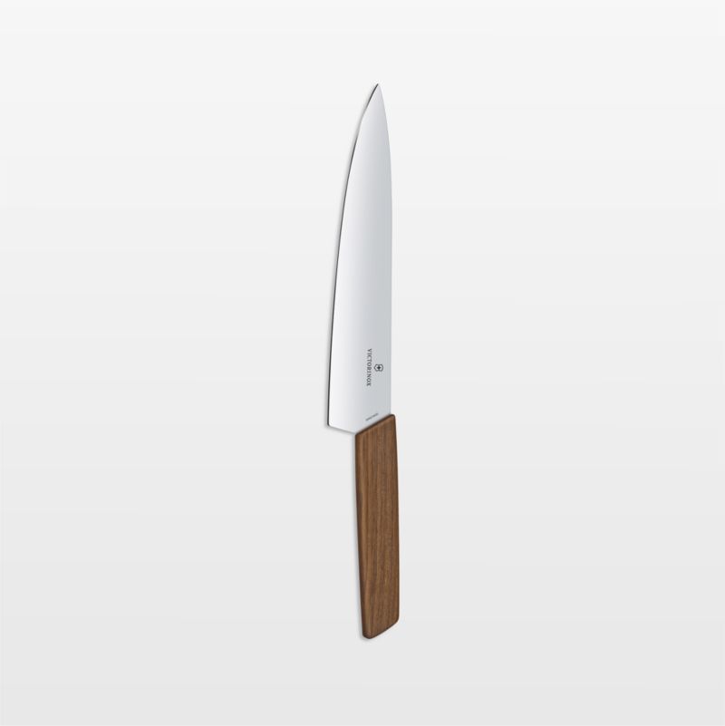 Great design and superb performance distinguish Victorinox's Swiss Modern carving knife. An extra wide, straight-edge blade makes this ideal for carving bigger cuts of meat as well as slicing roast beef or brisket. Ergonomically honed for ultimate comfort, the knife features an ultra-sharp blade and a beautiful, richly grained walnut wood handle.