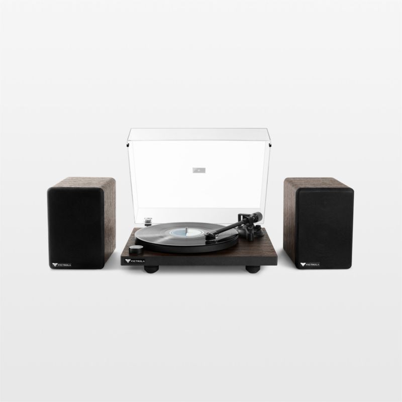 Sleek and minimalist, this stereo system provides an unparalleled listening experience with only three components. The T1 turntable meticulously reproduces the sounds of your favorite vinyl, with a high-performance moving magnetic cartridge that creates detailed clarity with a wider frequency response and specified downforce. The pair of bookshelf speakers joins the turntable—or your phone, laptop or tablet via Bluetooth—to produce superior sound. Elegant in black and dark wood, the trio instantly upgrades your experience of music, television, podcasts and more.