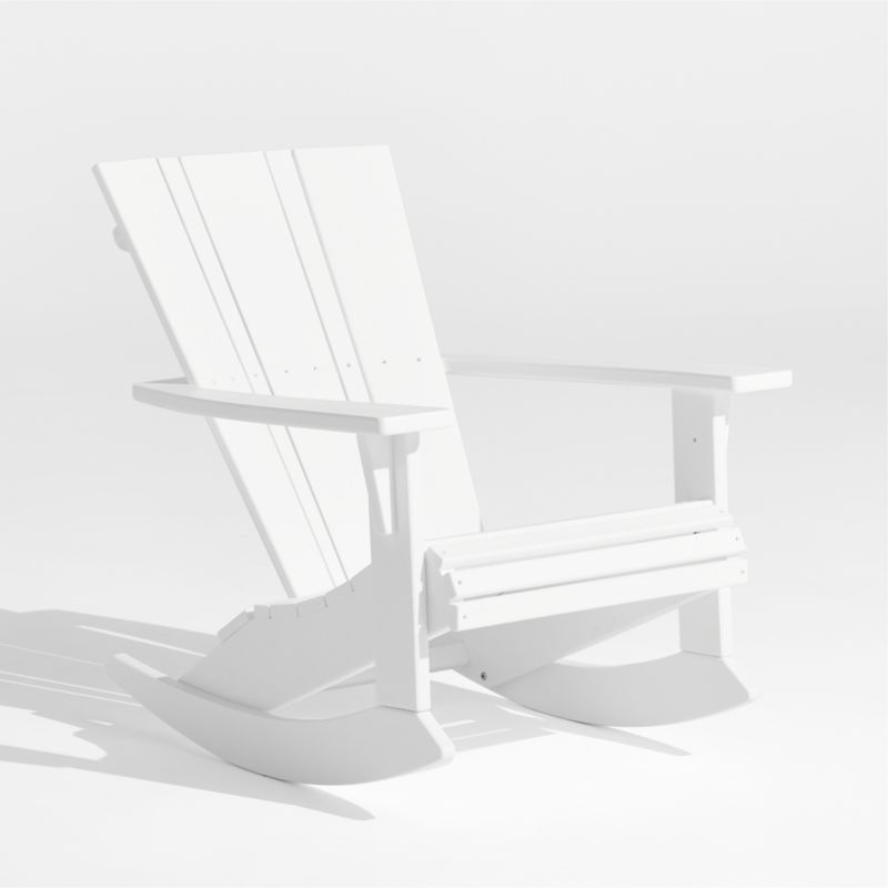 Made of plastic bottles with wood-like texture, this all-weather rendition of the classic Adirondack chair has the same iconic profile that's synonymous with summer. A sloped seat settles you back for relaxing, while the curved base lulls with a gentle rocking action. You'll love the hug of the angled wide-and-thin slat back as well as the extra-wide paddle armrests ready for propping a cool drink. Ready to greet the great outdoors in bright white, the Vista outdoor rocking chair is a Crate & Barrel Exclusive.