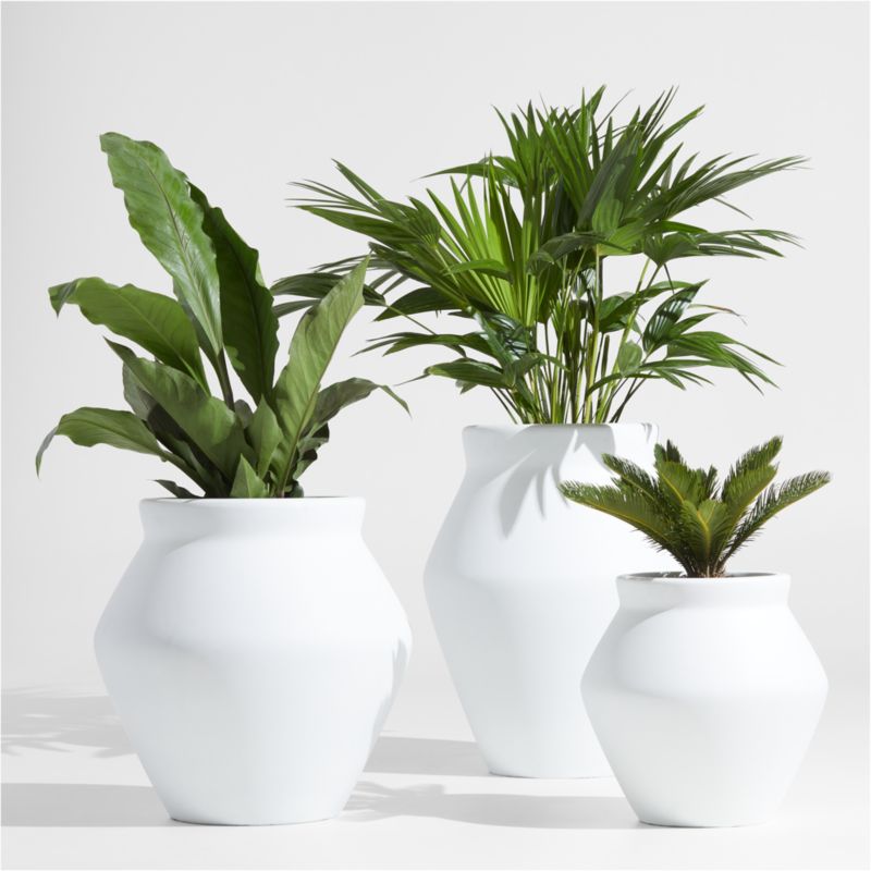 Resembling traditional storage jars, our Wabi planters streamline a classic shape for a look that's clean and contemporary. The planters' rounded bicone shape suits container plantings of flowers and trailing greens and lends modern refinement to patios, decks and balconies. Made of a mix of cement, sand and fiber, the white planters—available in three sizes—are lightweight, durable and frost-resistant.