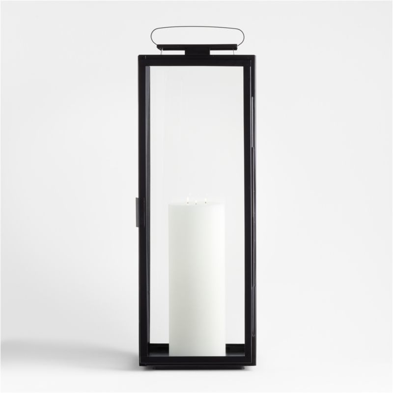The classic black iron lantern goes geometric in Walker. Panes of glass outlined in crisp black iron frames protect pillar candles from breezes and air currents. An oblong handle offers curved contrast to the extra-large, clean-lined lantern. Place one on either side of the fireplace mantel or group with our smaller Walker lanterns for a dramatic candlelight display.