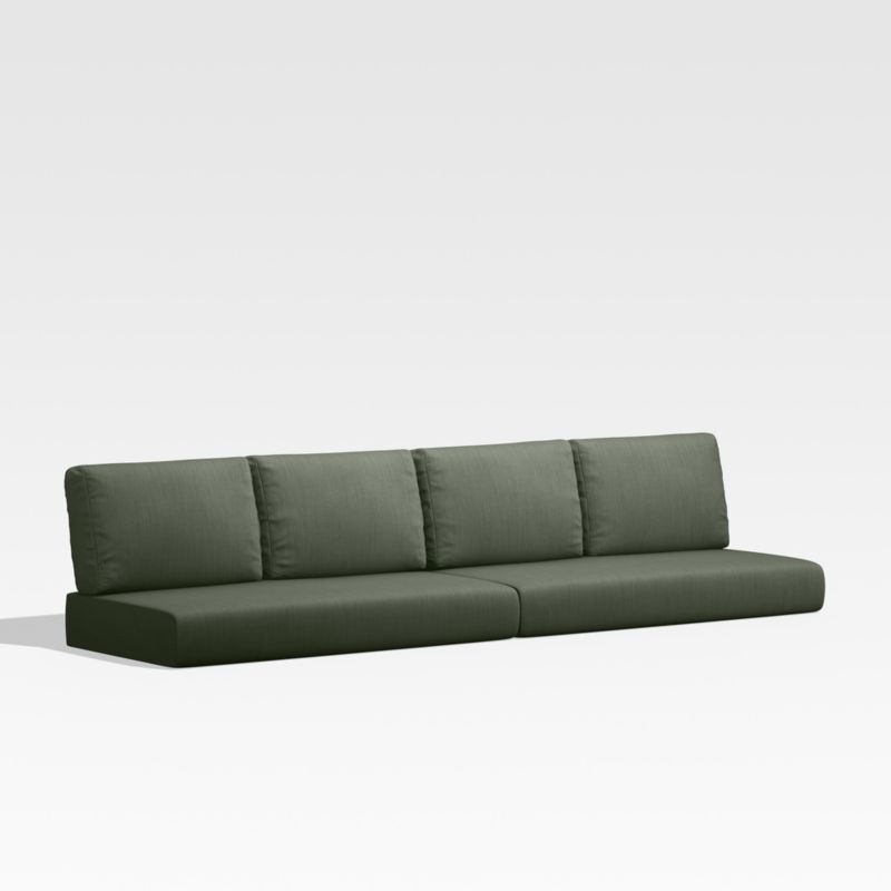 Add plush comfort and modern style to your Walker outdoor loveseat sectional with boxy seat and back cushions in sage green. Covered in highly durable, water and stain-resistant Sunbrella fabric, the cushions are neatly tailored with zippers that help to ventilate and facilitate drying.