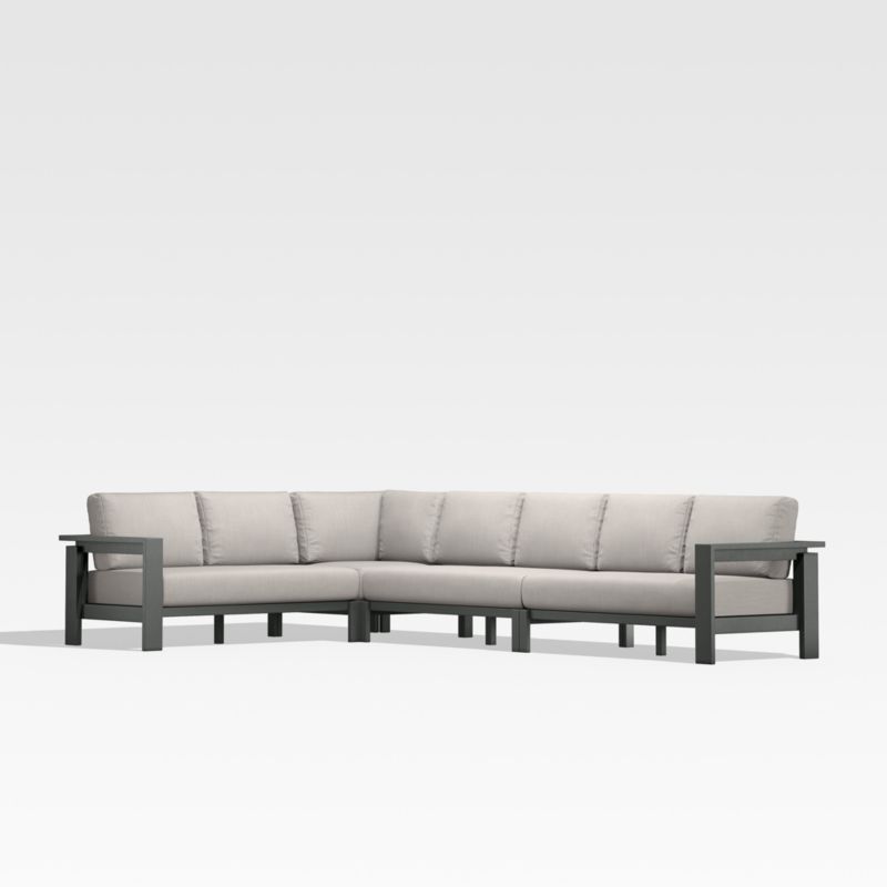 Well-made, great-looking and super comfortable. Our Walker outdoor sectional sofa collection is a customer favorite that checks all the boxes. Built to stand up to the elements, the sectional is made of rustproof aluminum treated with a durable and stylish matte powdercoat finish. Cushions in your color choice of stain-resistant Sunbrella fabric let you sink back and relax in deep-seated comfort. A modern classic, Walker is designed with architectural lines, wide armrests and recessed detailing.