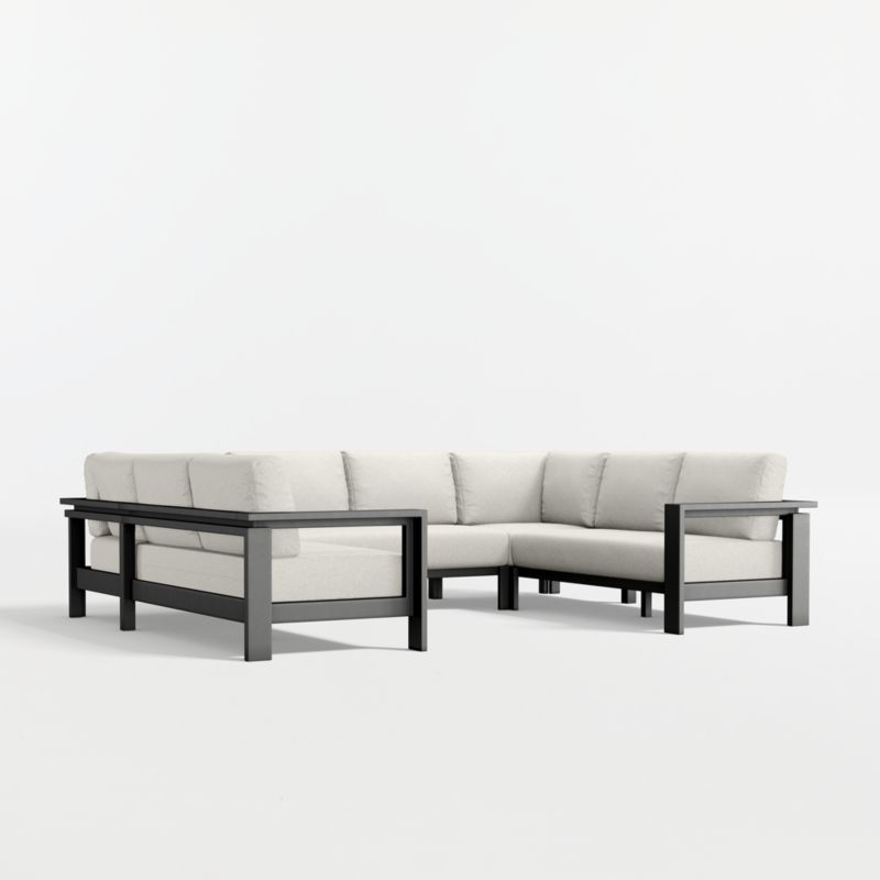 Well-made, great-looking and super comfortable. Our Walker outdoor sectional sofa collection is a customer favorite that checks all the boxes. Built to stand up to the elements, the sectional is made of rustproof aluminum treated with a durable and stylish matte powdercoat finish. Cushions in your color choice of stain-resistant Sunbrella fabric let you sink back and relax in deep-seated comfort. A modern classic, Walker is designed with architectural lines, wide armrests and recessed detailing.