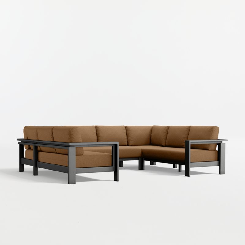 Well-made, great-looking and super comfortable. Our Walker outdoor sectional sofa collection is a customer favorite that checks all the boxes. Built to stand up to the elements, the sectional is made of rustproof aluminum treated with a durable and stylish matte powdercoat finish. Cushions in your color choice of stain-resistant Sunbrella fabric let you sink back and relax in deep-seated comfort. A modern classic, Walker is designed with architectural lines, wide armrests and recessed detailing.