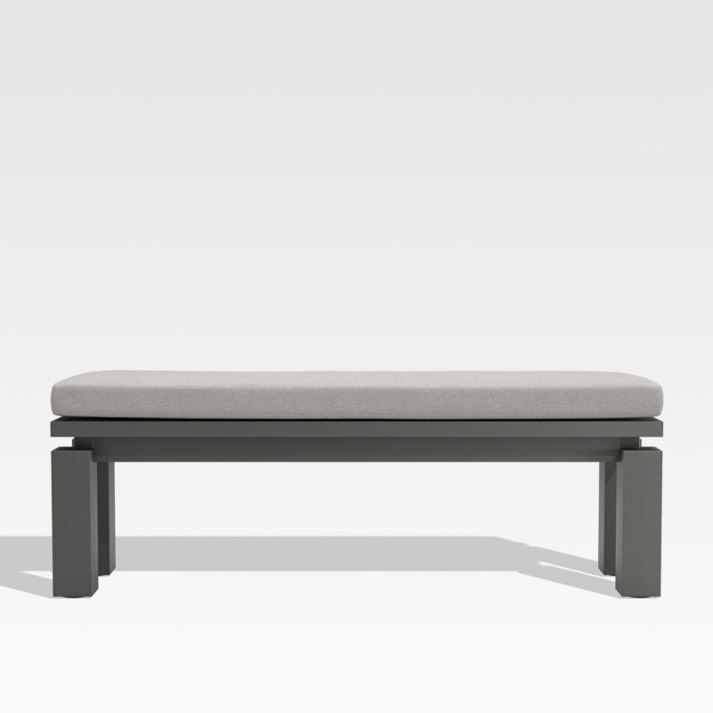 Made for chic alfresco entertaining, the design of our Walker dining bench is based on the recessed detailing and architectural lines of our bestselling Walker outdoor lounge collection. Constructed of durable aluminum with a dark grey finish, the dining chair sets back the frame to bring the plank-style legs into dimensional focus. A boxy seat cushion provides an extra layer of comfort and is covered in weather-resistant Sunbrella fabric. The coordinating Walker dining table makes for an inviting and stylish outdoor dining ensemble. Designed by Blake Tovin of Tovin Design, the Walker dining bench with seat cushion is a Crate & Barrel exclusive.