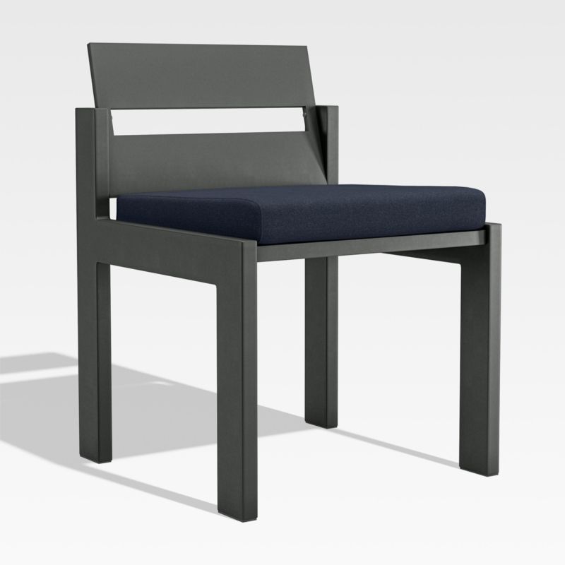 Made for chic alfresco entertaining, the design of our Walker side chair is based on the recessed detailing and architectural lines of our bestselling Walker outdoor lounge collection. Constructed of durable aluminum with a dark grey finish, the dining chair sets back the frame to bring the plank-style legs into dimensional focus. Boxy cushions provide an extra layer in comfort and are covered in weather-resistant Sunbrella fabric. The coordinating Walker dining table makes for an inviting and stylish outdoor dining ensemble.
