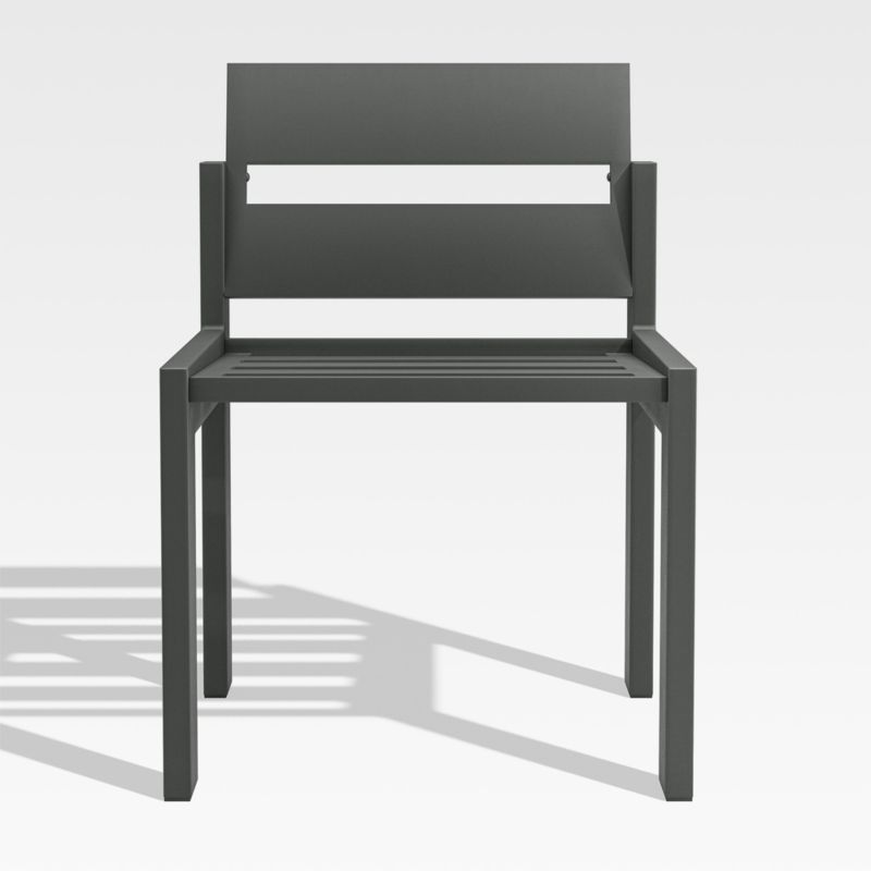 Made for chic alfresco entertaining, the design of our Walker dining chair is based on the recessed detailing and architectural lines of our bestselling Walker outdoor lounge collection. Constructed of durable aluminum with a dark grey finish, the dining chair sets back the frame to bring the plank-style legs into dimensional focus. The back slants for a comfortable recline. Pair with the Walker dining table for an inviting and stylish outdoor ensemble. Designed by Blake Tovin of Tovin Design, the Walker aluminum dining side chair is a Crate & Barrel exclusive.