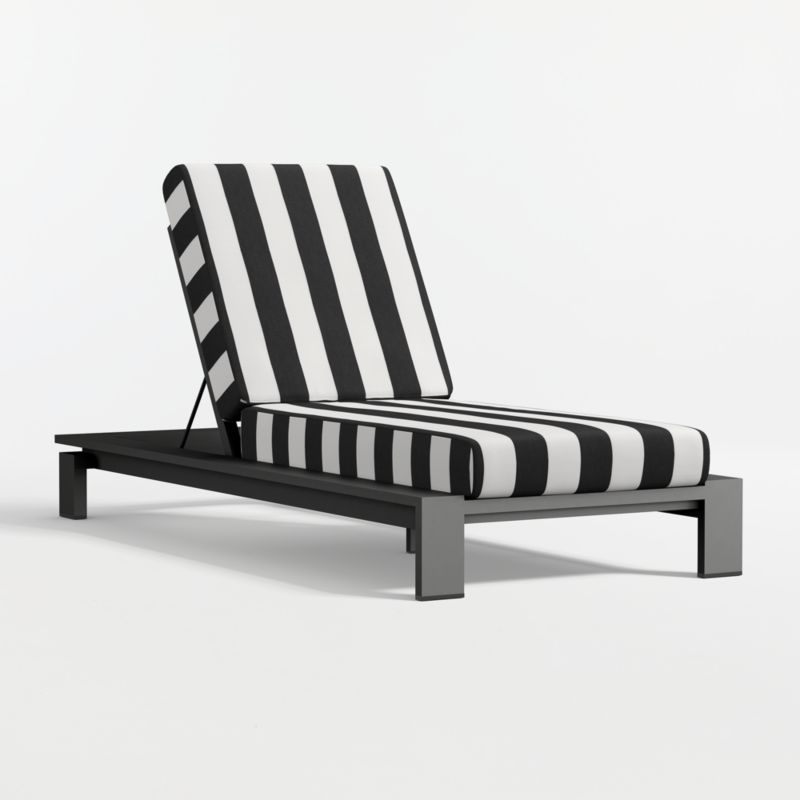 Sink back into deep-seated comfort, rplete with the recessed detailing, slat construction and architectural lines that define this bestselling outdoor furniture collection, the aluminum chaise lounge is powdercoated in dark grey. The back adjusts to four positions of recline to suit your lounging preference. Neatly tailored cushions add comfort and modern style, covered in weather-resistant Sunbrella fabric.