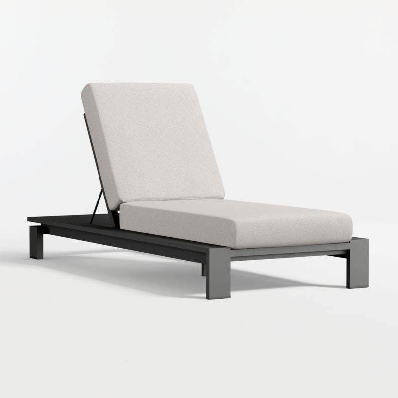 Sink back into deep-seated comfort, rplete with the recessed detailing, slat construction and architectural lines that define this bestselling outdoor furniture collection, the aluminum chaise lounge is powdercoated in dark grey. The back adjusts to four positions of recline to suit your lounging preference. Neatly tailored cushions add comfort and modern style, covered in weather-resistant Sunbrella fabric.