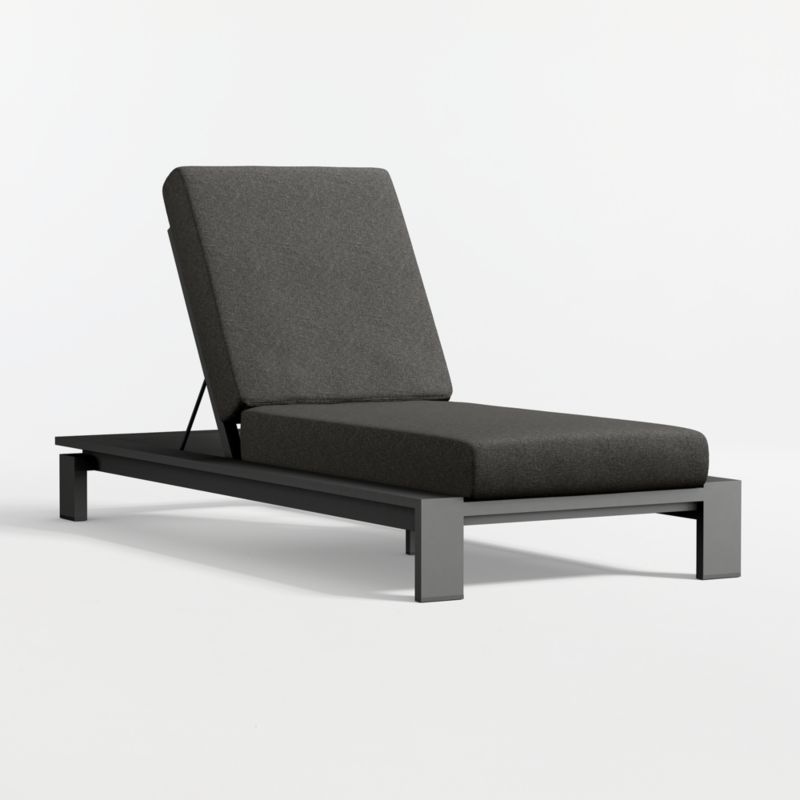 Sink back into deep-seated comfort, rplete with the recessed detailing, slat construction and architectural lines that define this bestselling outdoor furniture collection, the aluminum chaise lounge is powdercoated in dark grey. The back adjusts to four positions of recline to suit your lounging preference. Neatly tailored cushions add comfort and modern style, covered in weather-resistant Sunbrella fabric.