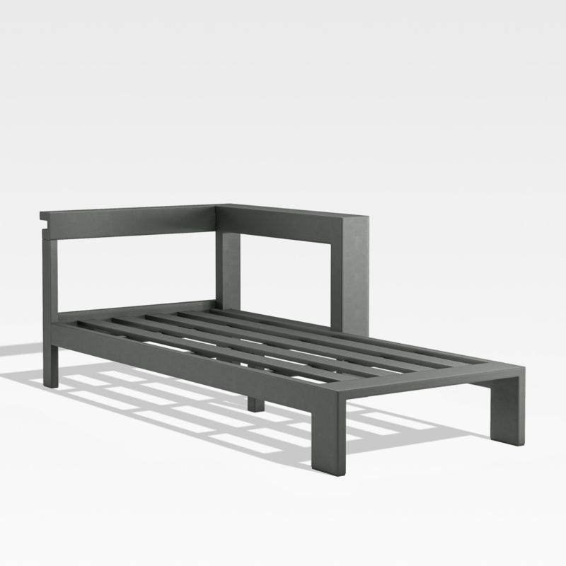 Sink back into the deep-seated, softly cushioned comfort of our Walker sectional collection. Made of aluminum finished in dark grey, the right-arm chaise features recessed detailing, architectural lines and a wide arm that's perfect for parking an icy beverage. For an extra layer of comfort add on boxy cushions covered in weather-resistant Sunbrella fabric (sold separately). The Walker right-arm chaise is a Crate & Barrel exclusive.