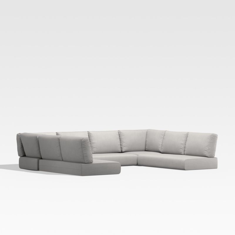 Add plush comfort and modern style to your Walker five-piece outdoor sectional sofa with boxy seat and back cushions in silver. Covered in highly durable, water and stain-resistant Sunbrella fabric, the cushions are neatly tailored with zippers that help to ventilate and facilitate drying.