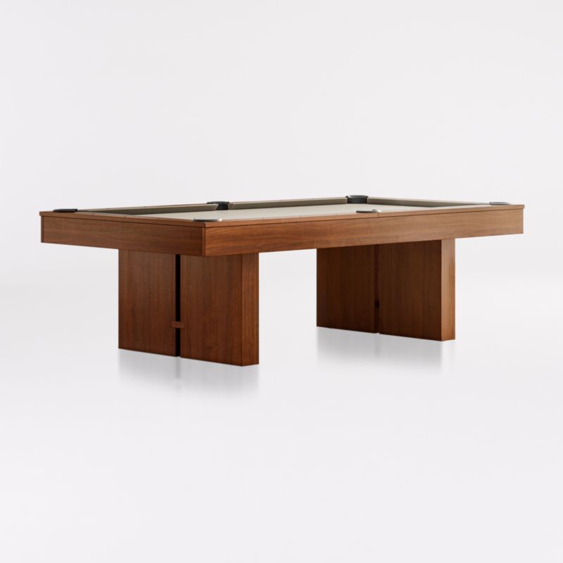 This stunning piece combines two classic game tables in one. Made for us exclusively by Imperial USA, this table spares no detail in bringing you the ultimate game of pool in a clean, modern design you'll treasure for years. When you're in more of a table tennis mood, simply add the topper and net. Everything's included to get games going, including four maple cues, billiard balls, ball rack, chalk and wall rack, plus table tennis paddles, balls and net. Crafted of beautifully grained black walnut with a warm honey finish, this pool table is not only handsome, it is specially constructed to last and perform—made with one-inch thick slate and oversized, interlocking beams to keep the cabinet from warping or sagging. We've covered the table in Teflon-coated khaki felt to provide protection from spills, and it features honey-finished black walnut rails with deep charcoal bronze sights and charcoal leather drop pockets.