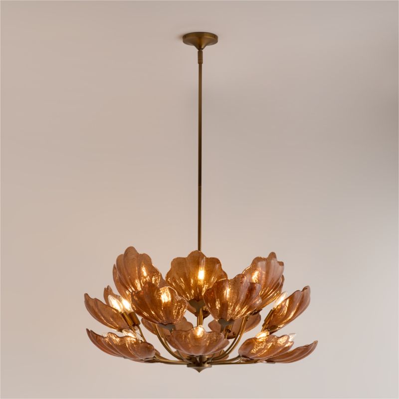 This stunning chandelier was inspired by dancing under moonlit trees. Hand-blown by highly skilled artisans, 24 glass gingko leaf-shaped shades cast a magical glow. The smoky blush tint and seeded texture of the glass enhance the glamorous vintage vibe. A true showstopper, the Waltz chandelier has a warm, lush presence overhead that totally transforms a room.