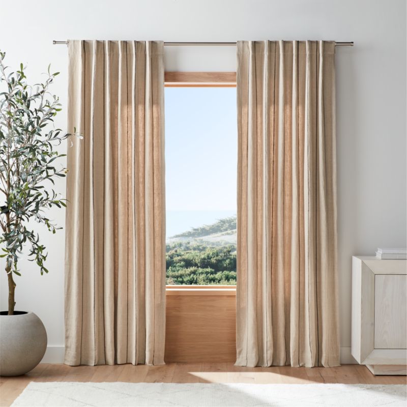 Our curtain panels frame windows with the breezy look of natural linen. Showcasing the organic beauty of woven linen, the warm beige curtain has a hint of decor-friendly pattern in delicate double-lined vertical pinstripes in cool grey. Hang our cotton-lined linen curtains from the back tabs for an elegant pleated style, use the rod pocket to create a more laid-back gathered look or add a set of our curtain clips (sold separately)