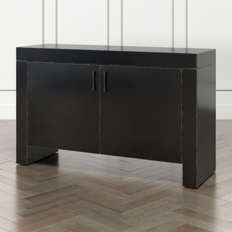 Made of poplar and tanganyika veneer, the storage cabinet goes at right angles to shape a modern, Parsons-style frame bracketing two double doors. Slim gunmetal pulls open the cabinet to reveal two adjustable shelves for dining or media room storage. The Waterfall Bruno Black Storage Cabinet is a Crate & Barrel exclusive.