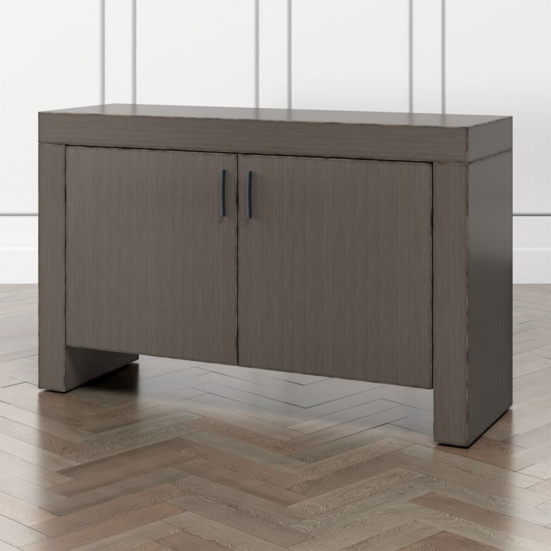 Made of poplar and tanganyika veneer, the storage cabinet goes at right angles to shape a modern, Parsons-style frame bracketing two double doors. Slim gunmetal pulls open the cabinet to reveal two adjustable shelves for dining or media room storage. The Waterfall Grigio Storage Cabinet is a Crate & Barrel exclusive.