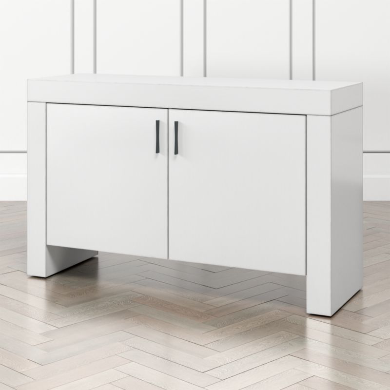 Waterfall's clean waterfall design provides the perfect canvas for Italian artisans to show off their exceptional made-to-order finishes. Applied in multiple steps, the table is painted and distressed by hand. Made of poplar and tanganyika veneer, the storage cabinet goes at right angles to shape a modern, Parsons-style frame bracketing two double doors. Slim gunmetal pulls open the cabinet to reveal two adjustable shelves for dining or media room storage. The Waterfall White Storage Cabinet is a Crate & Barrel exclusive.