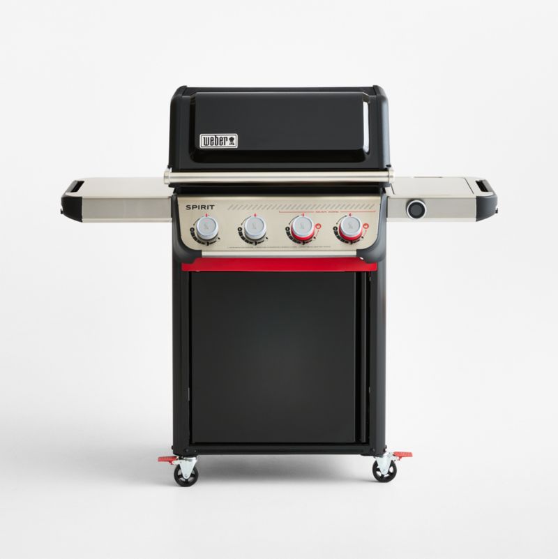 This four-burner gas grill is a backyard chef's dream. Burgers, wings, fish and veggies grill evenly and consistently regardless of where they're placed on the porcelain-enameled cast iron cooking grate with Flavorizer bars. Two Booster Burners unleash 40% more power in the sear zone, making it easy to create bold, flavorful sear marks on everything you grill. Snap-Jet Ignition lets you easily light individual burners with one hand, and the electronic ignition system fires up the grill quickly and reliably. A lid-mounted thermometer lets you monitor what's cooking with a digital display that can be read night or day. Side tables provide extra room grilling supplies and pans, and a cabinet hides a propane tank and more. Finished in black with red and stainless steel accents, the grill takes pride of place on your patio or deck.