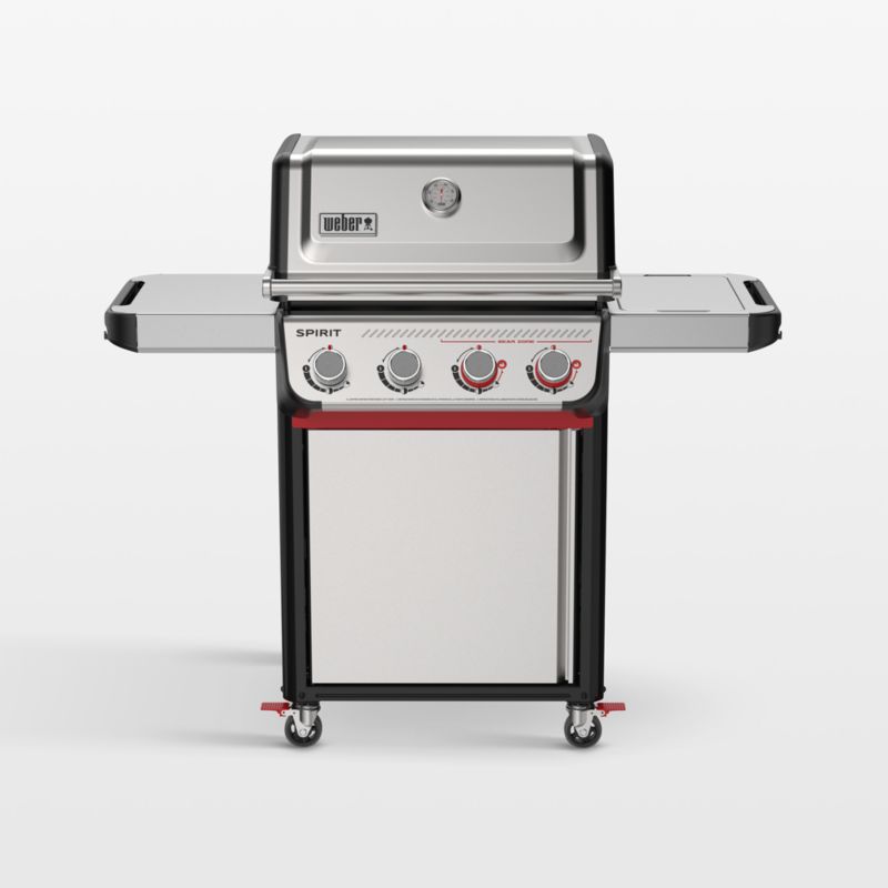 This four-burner gas grill is a backyard chef's dream. Burgers, wings, fish and veggies grill evenly and consistently regardless of where they're placed on the porcelain-enameled cast iron cooking grate. Two Booster Burners unleash 40% more power in the sear zone, making it easy to create bold, delicious sear marks on everything you grill—and the Flavorizer bars add extra grilled flavor. Snap-Jet Ignition lets you easily light individual burners with one hand, the electronic ignition system firing up the grill quickly and reliably. Side tables provide extra room for grilling supplies, and a cabinet hides a propane tank and more. Sleek in stainless steel with red and black accents, the grill takes pride of place on your patio or deck.