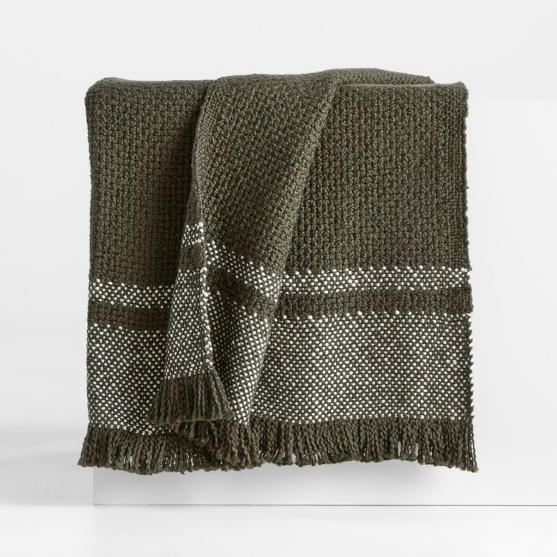 Our deep olive Weekend throw drapes sofas, beds and chairs with rich color, loads of texture and border-stripe detailing. The organic cotton throw blanket incorporates white yarn in a flat weave at both ends to create light green bands that provide color contrast and a textural complement to the chunky seed stitch. Brushed fringe adds to the throw's well-crafted appeal achieved by talented textiles artists who put hours into perfecting each throw.