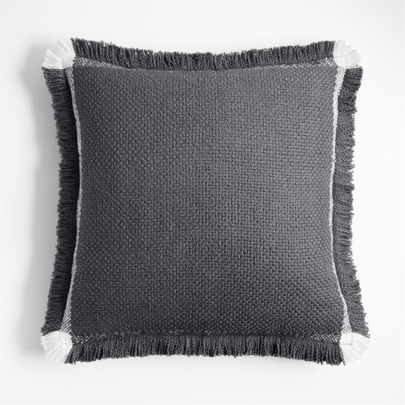 Our grey Weekend pillow graces sofas, beds or chairs with rich color, loads of texture and border-stripe detail. White yarn combines with the dark grey in a flat weave along the edges, framing the seed-stitched pillow in a band of light grey and going solo at the corners to give pops of white to the brushed fringe. We love the organic cotton pillow's well-crafted appeal, achieved by skilled textile artists who put hours into perfecting each pillow. Pair with the matching throw for a coordinated and graphic look. For maximum comfort, our exclusive square pillow includes your choice of a plush feather-down or lofty down-alternative insert.