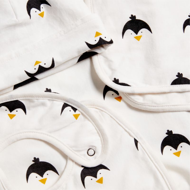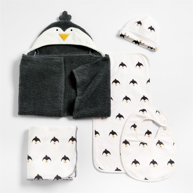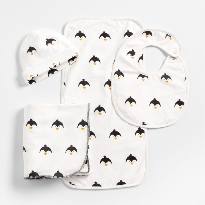 Extremely soft, breathable and oh-so-comfy, our set of 100% organic cotton accessories puts four baby essentials in one sweet (and highly giftable) bundle. Swaddle baby in the blanket, slip on the cozy cap, or use the bib and burp cloth for on-the-go meals. However caregivers choose to use the pieces, our adorable penguin print keeps it all looking cute and coordinated.