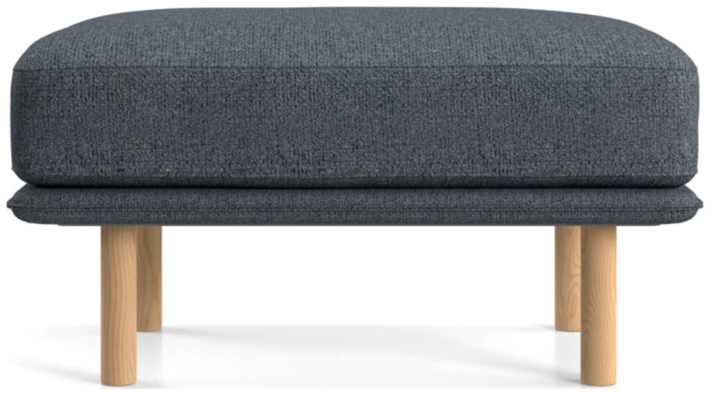 Designed to accompany our Wells chair, this ottoman looks modern and inviting as it tops the seat cushion on a slim frame supported by sustainably sourced solid wood legs with a natural finish. The low deck allows plenty of room for an indulgent seat cushion that encourages you to linger. Tailored with top stitching and French seams, the soft, stain-repellent twill fabric suits active family life and cleans up beautifully. Our Wells ottoman is a Crate & Barrel exclusive.