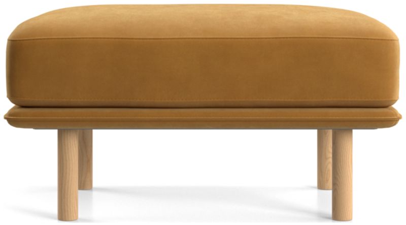 Designed to accompany our Wells chair, this ottoman looks modern and inviting as it tops the seat cushion on a slim frame supported by sustainably sourced solid wood legs with a natural finish. The low deck allows plenty of room for an indulgent seat cushion that encourages you to linger. Tailored with top stitching and French seams, the soft, stain-repellent twill fabric suits active family life and cleans up beautifully. Our Wells ottoman is a Crate & Barrel exclusive.