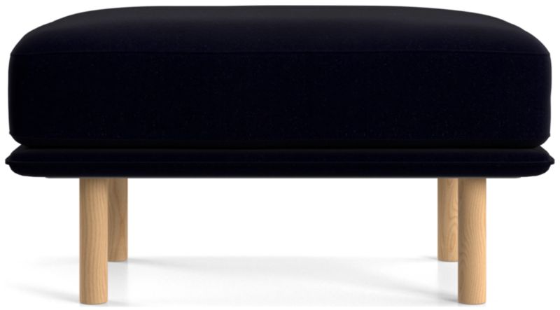 Designed to accompany our Wells chair, this ottoman looks modern and inviting as it tops the seat cushion on a slim frame supported by sustainably sourced solid wood legs with a natural finish. The low deck allows plenty of room for an indulgent seat cushion that encourages you to linger. Tailored with top stitching and French seams, the soft, stain-repellent twill fabric suits active family life and cleans up beautifully. Our Wells ottoman is a Crate & Barrel exclusive.
