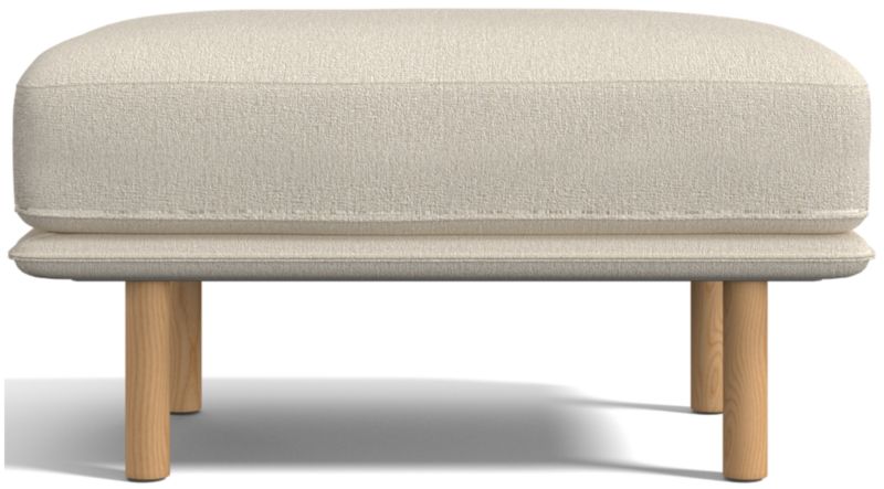 Designed to accompany our Wells chair, this ottoman looks modern and inviting as it tops the seat cushion on a slim frame supported by sustainably sourced solid wood legs with a natural finish. The low deck allows plenty of room for an indulgent seat cushion that encourages you to linger. Tailored with top stitching and French seams, the soft, stain-repellent twill fabric suits active family life and cleans up beautifully. Our Wells ottoman is a Crate & Barrel exclusive.
