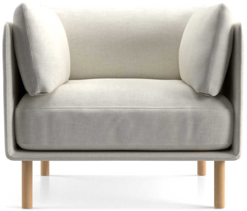An updated version of the classic club chair, Wells looks modern and inviting as it tucks cushions onto a slim frame supported by round wooden legs with a natural finish. The low deck allows plenty of room for an indulgent seat cushion that encourages you to linger. Tailored with top stitching and French seams on the cushions and a crisp micro-flange outlining the frame, the soft, stain-repellent twill fabric suits active family life and cleans up beautifully. Our Wells chair is a Crate & Barrel exclusive.