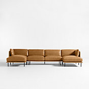 Indulge in the sumptuous leather surround of our Wells sectional. An updated version on the classic leather sofa, the four-piece combination-left-arm chaise, corner, armless sofa and right-arm sofa-looks rustic and modern as it tucks cushions onto a slim frame supported by iron legs. The beautiful top-grain, full-aniline leather offers a smooth sheen and lustrous look, tailored with topstitching and French seams. Carefully selected for its fine quality and distinctive markings, the leather will develop an even richer patina over time.