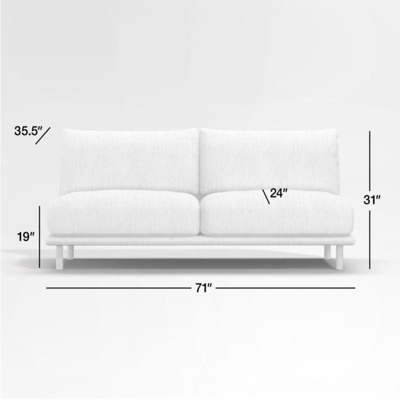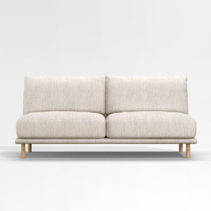 Modern, sophisticated and undeniably inviting, our Wells sectional collection tucks plump cushions onto a slim frame supported by sustainably sourced solid wood legs with a natural finish. The armless sofa's low deck allows plenty of room for an indulgent seat cushion that encourages you to linger. Tailored with top stitching and French seams on the cushions and a crisp micro-flange outlining the frame, the soft twill fabric suits active family life and cleans up beautifully. Our Wells armless sofa is a Crate & Barrel exclusive.