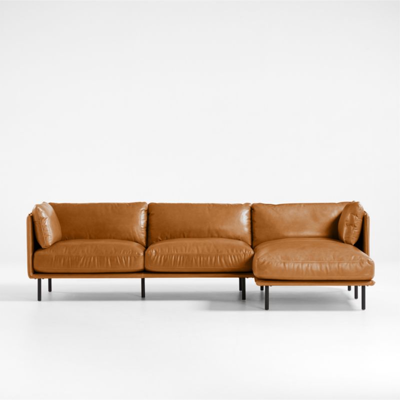 Indulge in the sumptuous leather surround of our Wells sectional. An updated version on the classic leather sofa, the combination of left-arm sofa and right-arm chaise looks rustic and modern as it tucks cushions onto slim frames supported by iron legs. Tailored with top stitching and French seams on the arms, the beautiful top-grain leather glows with an heirloom patina that results when oils and waxes applied during the finishing process are stretched to create lighter tones known as "burst." Uniquely patterned with natural markings, each one-of-a-kind two-piece sectional is a Crate & Barrel exclusive.