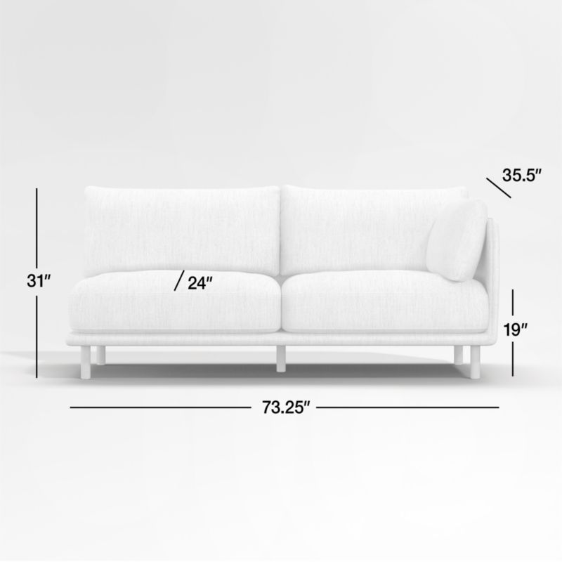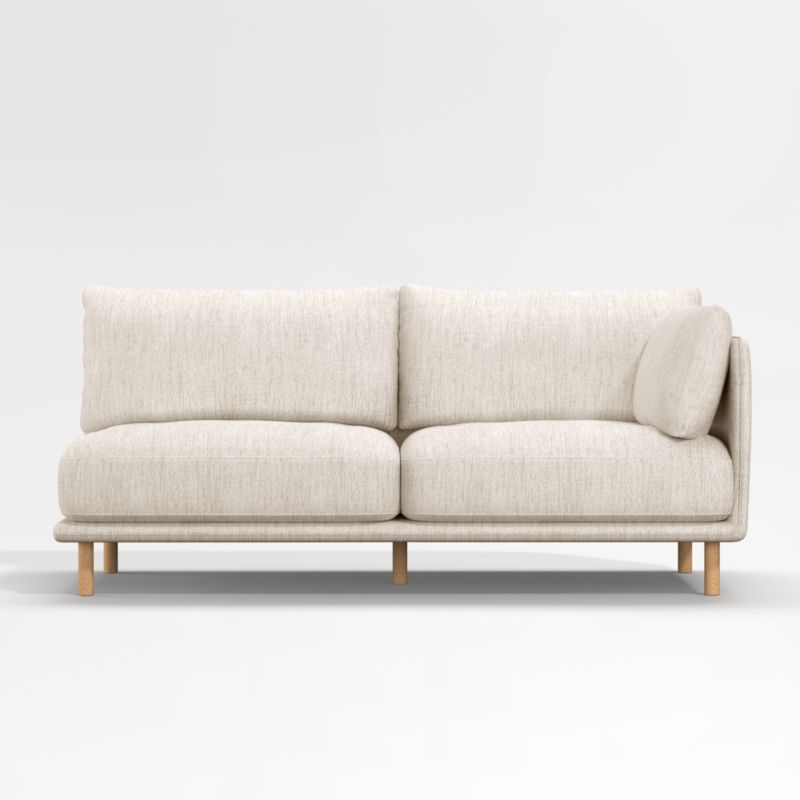 Modern, sophisticated and undeniably inviting, our Wells sectional collection tucks plump cushions onto a slim frame supported by sustainably sourced solid wood legs with a natural finish. The right-arm sofa's low deck allows plenty of room for an indulgent seat cushion that encourages you to linger. Tailored with top stitching and French seams on the cushions and a crisp micro-flange outlining the frame, the soft twill fabric suits active family life and cleans up beautifully. Our Wells right-arm chaise is a Crate & Barrel exclusive.